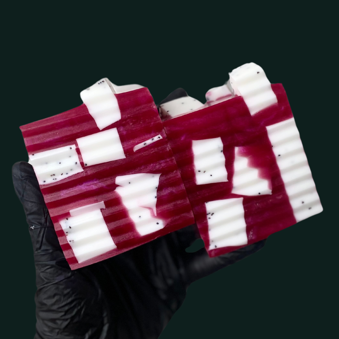Infused with natural ingredients. Enjoy a delicious blend of dragon fruit, apple, ripe melon, and strawberry. This bar was handcrafted blending essential oils Peppermint, Poppy Seeds, Strawberry Powder, and Fragrance Oil. Use this bar for a light exfoliation and gentle cleanser. For external use only.