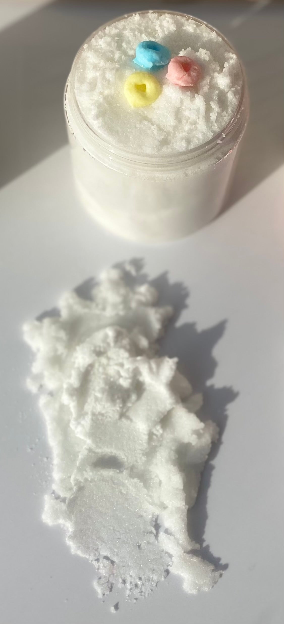 This scrub was created using Organic Sugar, Coconut Oil, lemon, lime, grapefruit, lemongrass, verbena, vanilla sugar, Foaming Whip, Shea Butter, and much more.