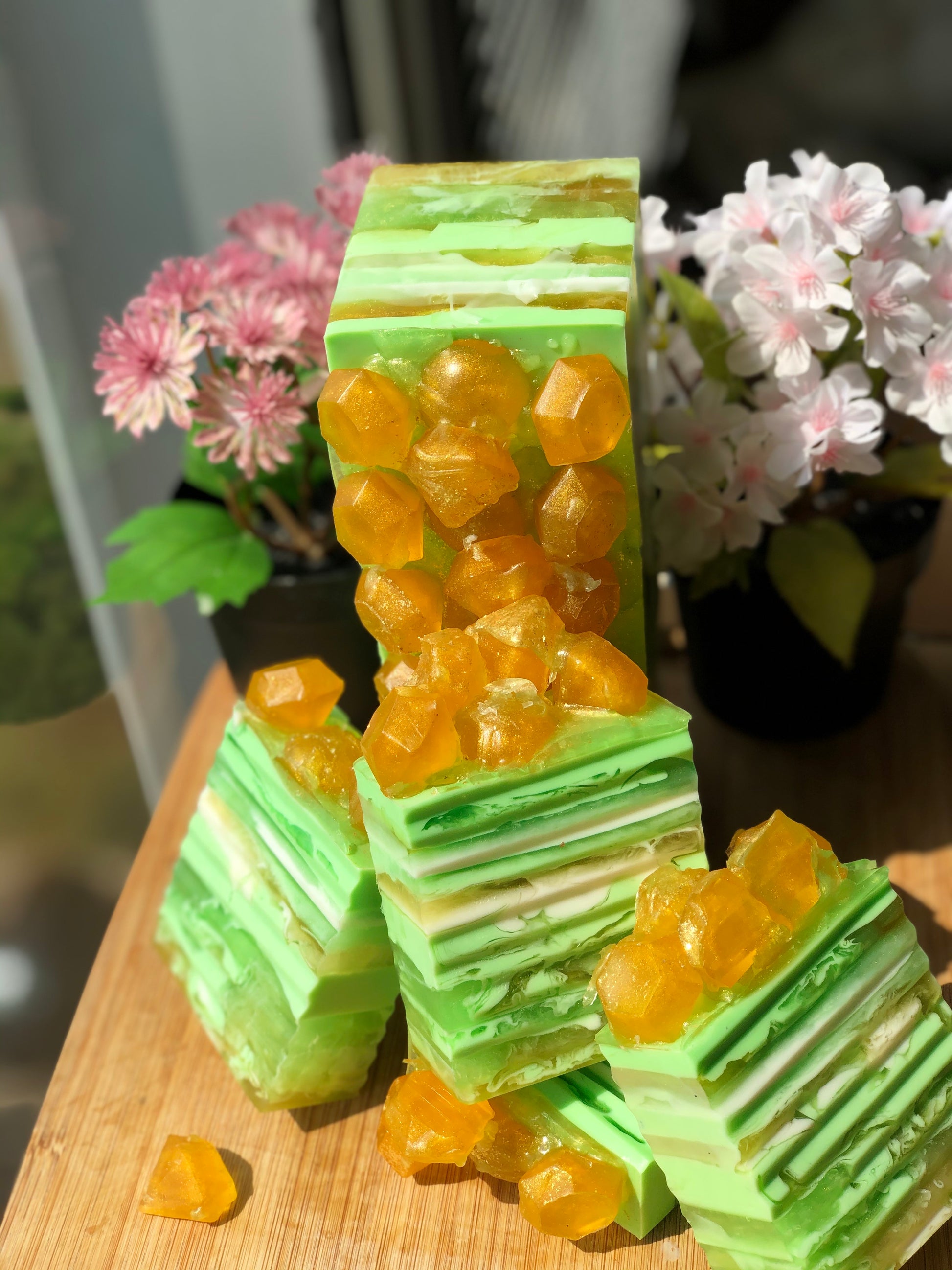 Infused with 100% natural ingredients. Get in your bag! Indulge and refresh yourself with the sweetest scent of coconut colada with honey. Jumbo diamond soap embeds are infused for festivity. Use this bar to help naturally restore your pH balance and eliminate odor. For external use only. This bar was handcrafted using essential oils Coconut oil, Clove, Oregano, Pineapple Extract, Gold Mica, Honey, & Menthol Oil. This bar may also help to rid BV, and menstrual cramps. For external use only.