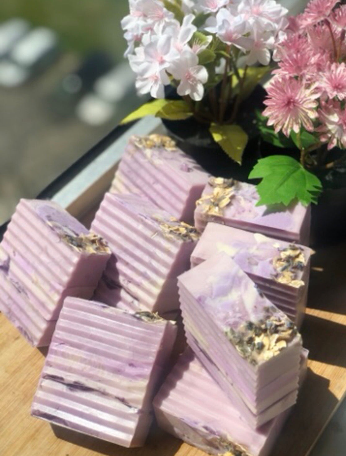 Infused with 100% natrial ingredients. This bar was handcrafted using essential oils Lavender, Lavender seeds, Oats, & Honey. Chopped oats and Lavender buds act as a gentle exfoilant. Recommended for sensitive skin. Use to calm, soothe, and relieve itchy and dry skin. Work great for eczema.