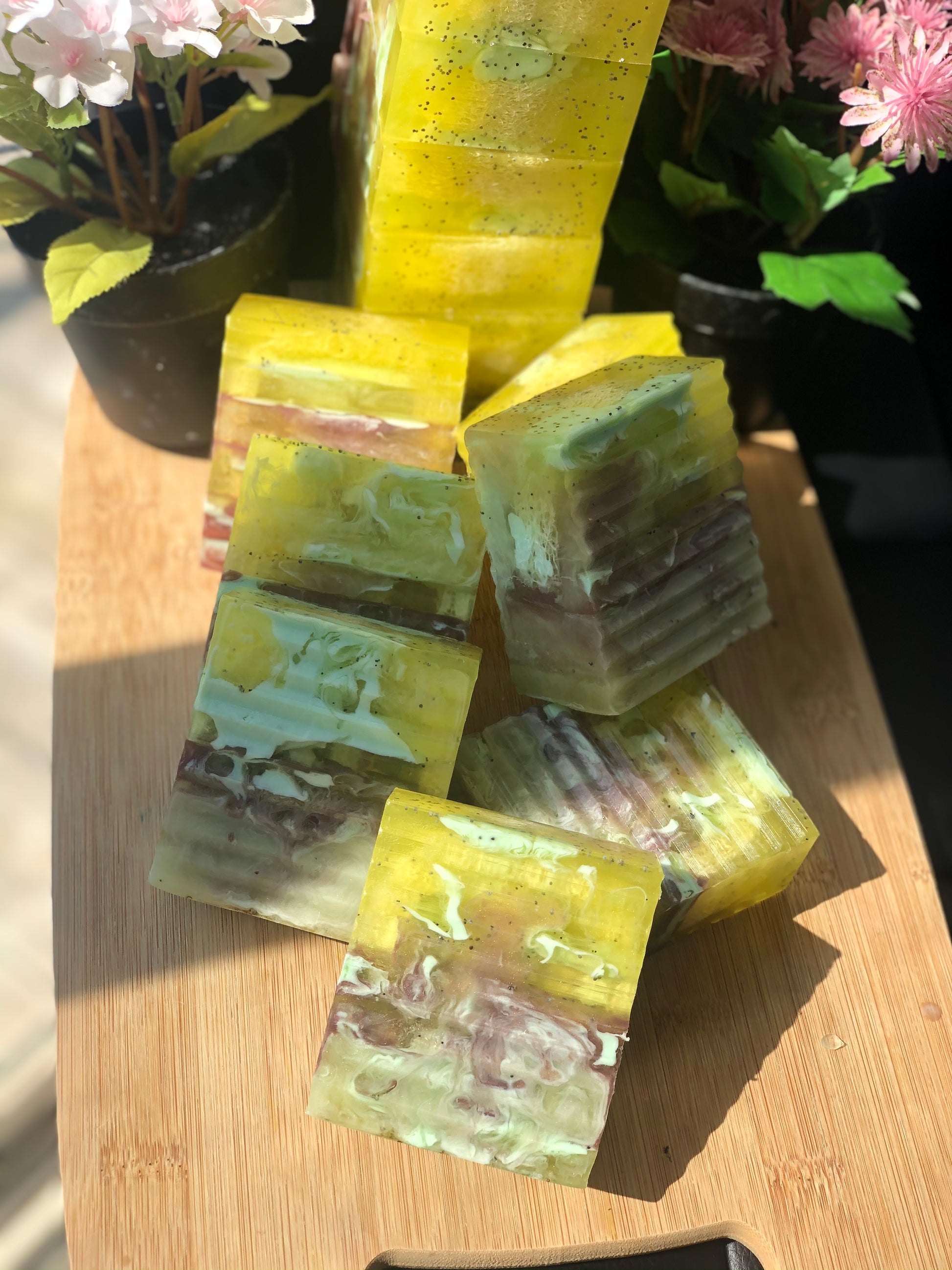 Infused with 100% natural ingredients. Need a pick me up? This bar was handcrafted using essential oil Lemon, Basil, Spearmint, Jojoba, poppy seeds, and much more. Use this bar to cleanse, moisturize, and increase your mood. Use this bar to help naturally restore your pH balance and eliminate odor. For external use only.