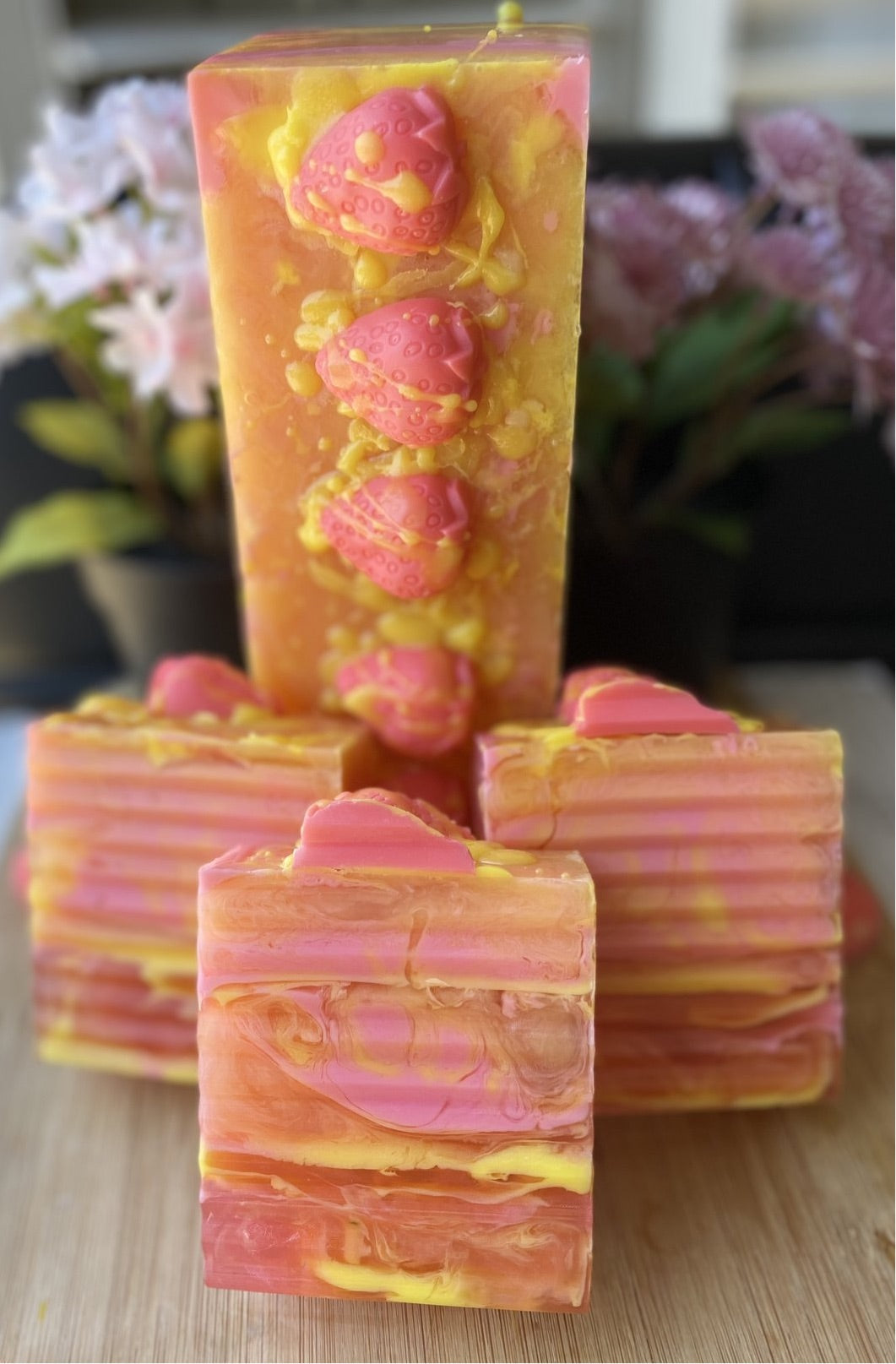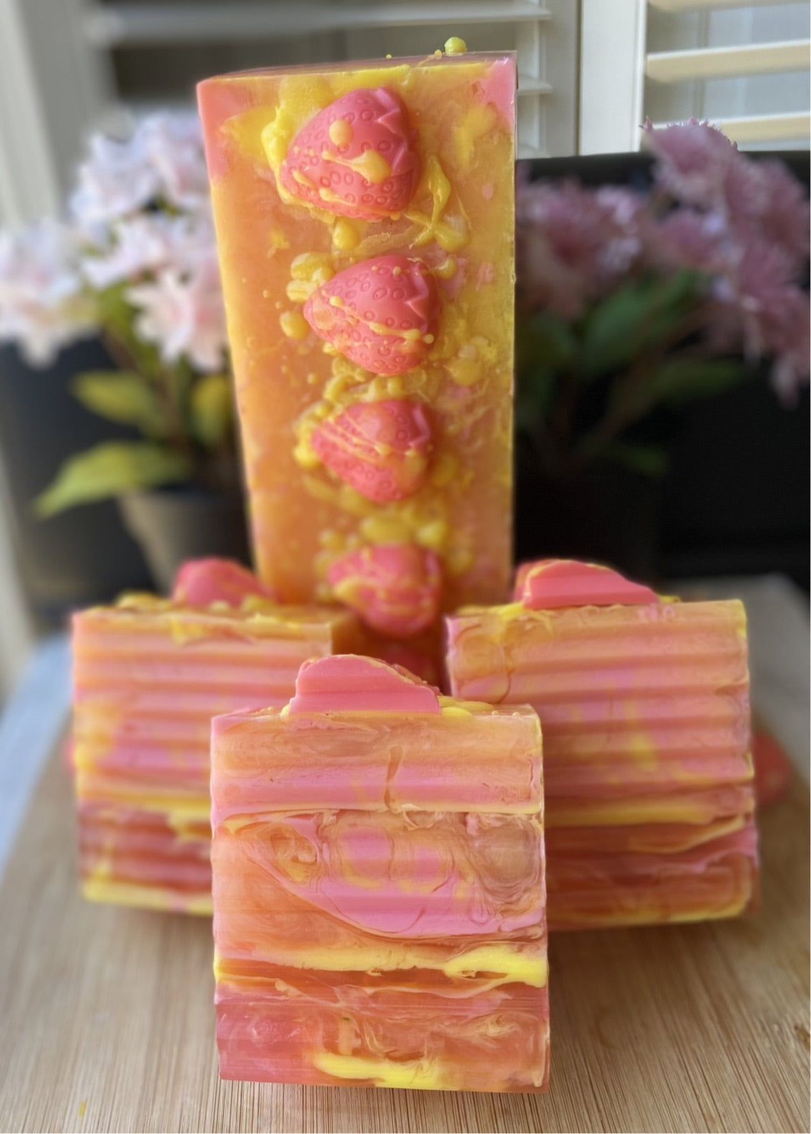 Infused with natural ingredients. The besssst duo hands down! Get your Strawberry & Banana fix! This bar was handcrafted using essential oils Vanilla, Coconut, Strawberry F/O, Banana F/O, Shea Butter, and much more. Use this bar to cleanse, moisturize, and boost your overall mood. For External Use Only.