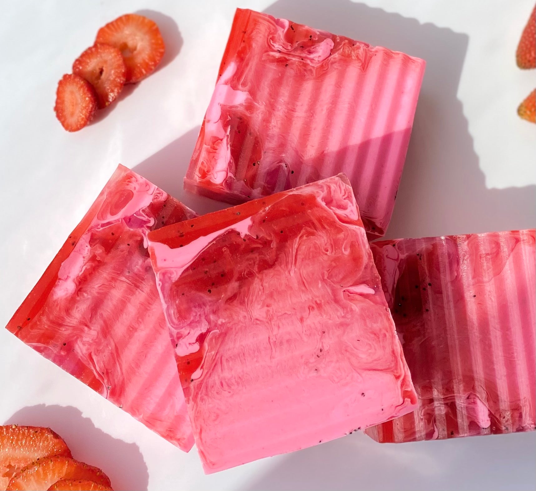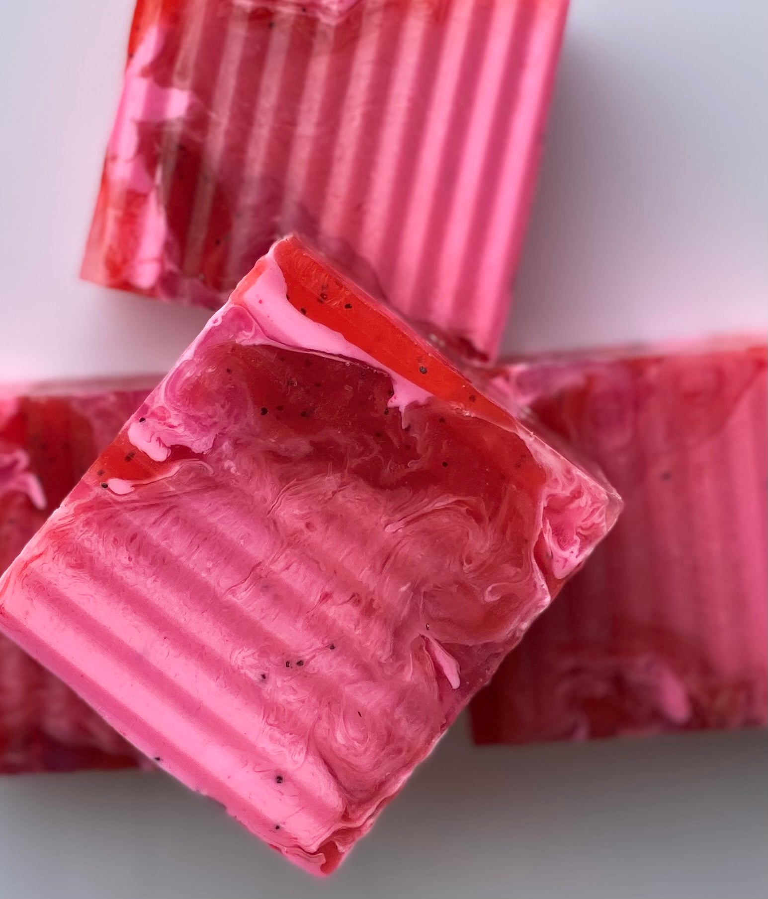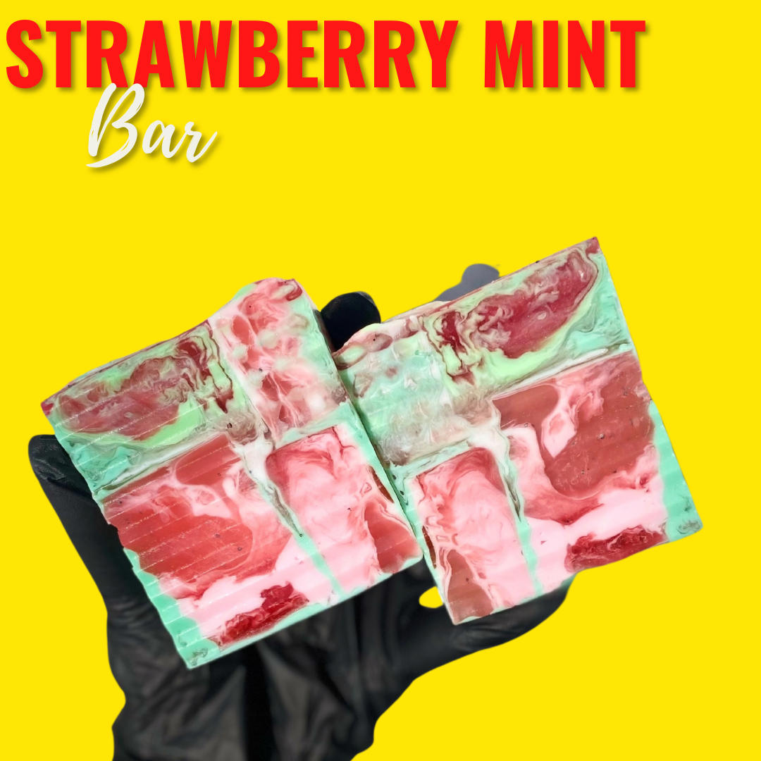 Infused with natural ingredients. Indulge in our minty but sweet Strawberry Mint Bar! This bar was handcrafted with a citrus blend of essential oils Peppermint and Strawberry. Poppy seeds are added for gentle exfoliation! Use to cleanse and hydrate your skin with tons of moisturizing skin-loving sweetness.