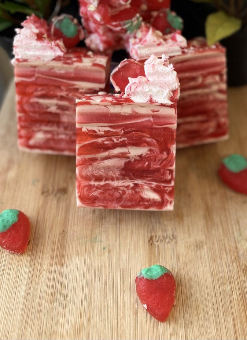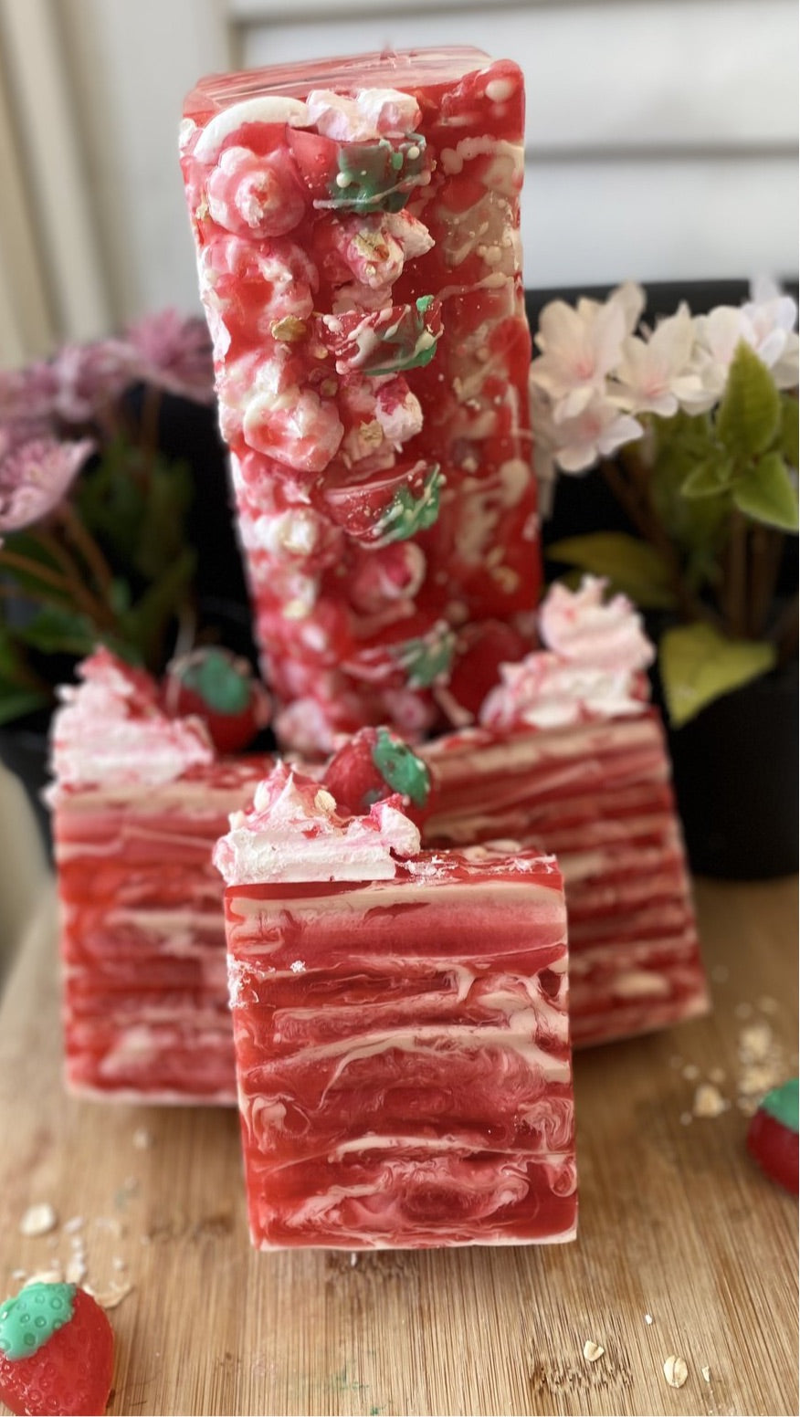 Fall in love with this sweet and delectable treat! This bar was handcrafted using essential and fragrance oils Vanilla, Strawberry Glycerin, and much more. Use this bar to cleanse, provide hydration, moisture. For external use only.