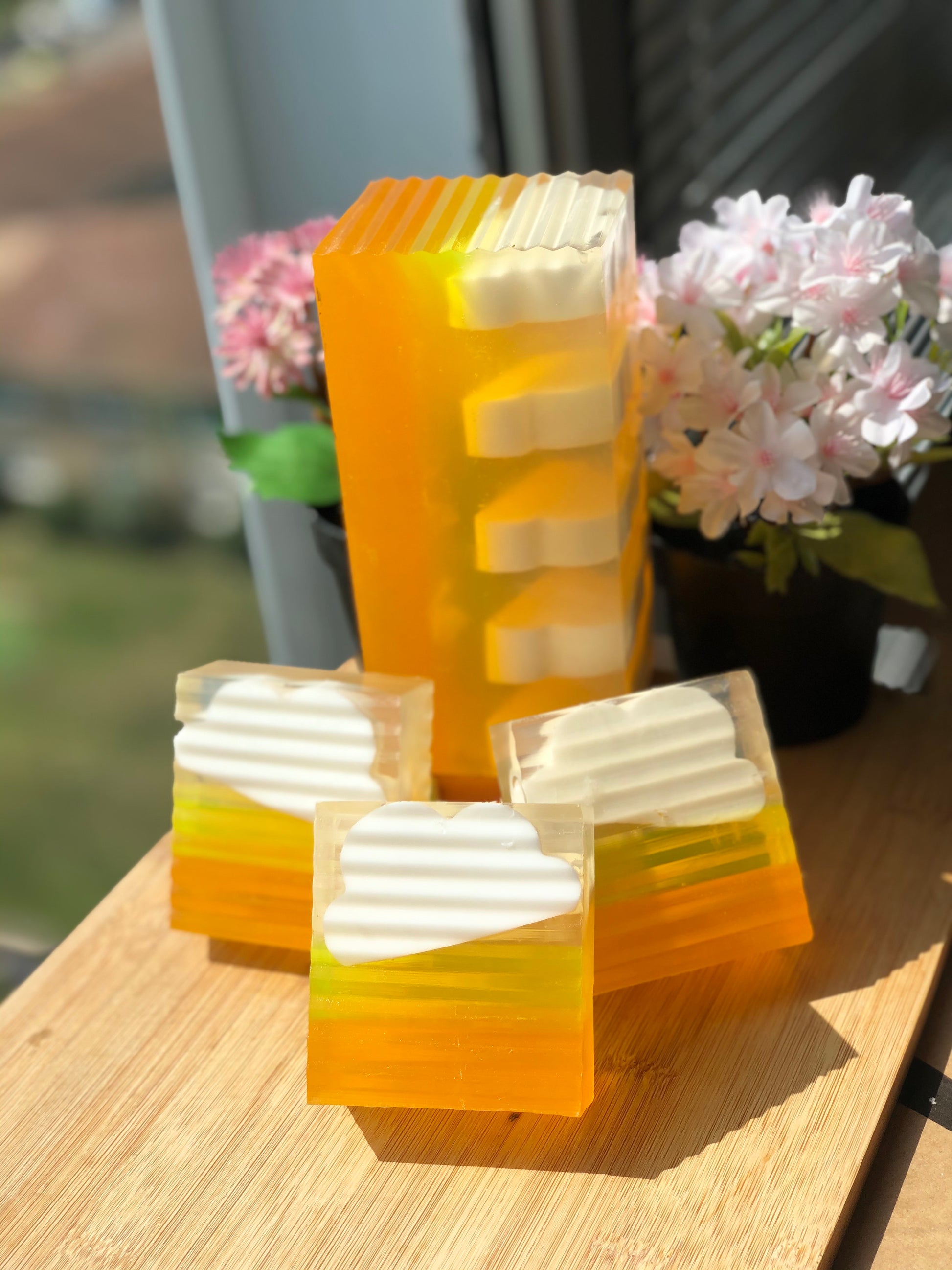 Infused with 100% natural ingredients. Say good morning to a sweet, refreshing, and moisturizing bar loaded with tons of antioxidants! Cute and fluffy cloud soaps are embedded. This bar was handcrafted using essential oils, Lemon, Grapefruit, Orange, Coconut oil, Vitamin E, and much more! Use to cleanse, add moisture, and increase your mood.