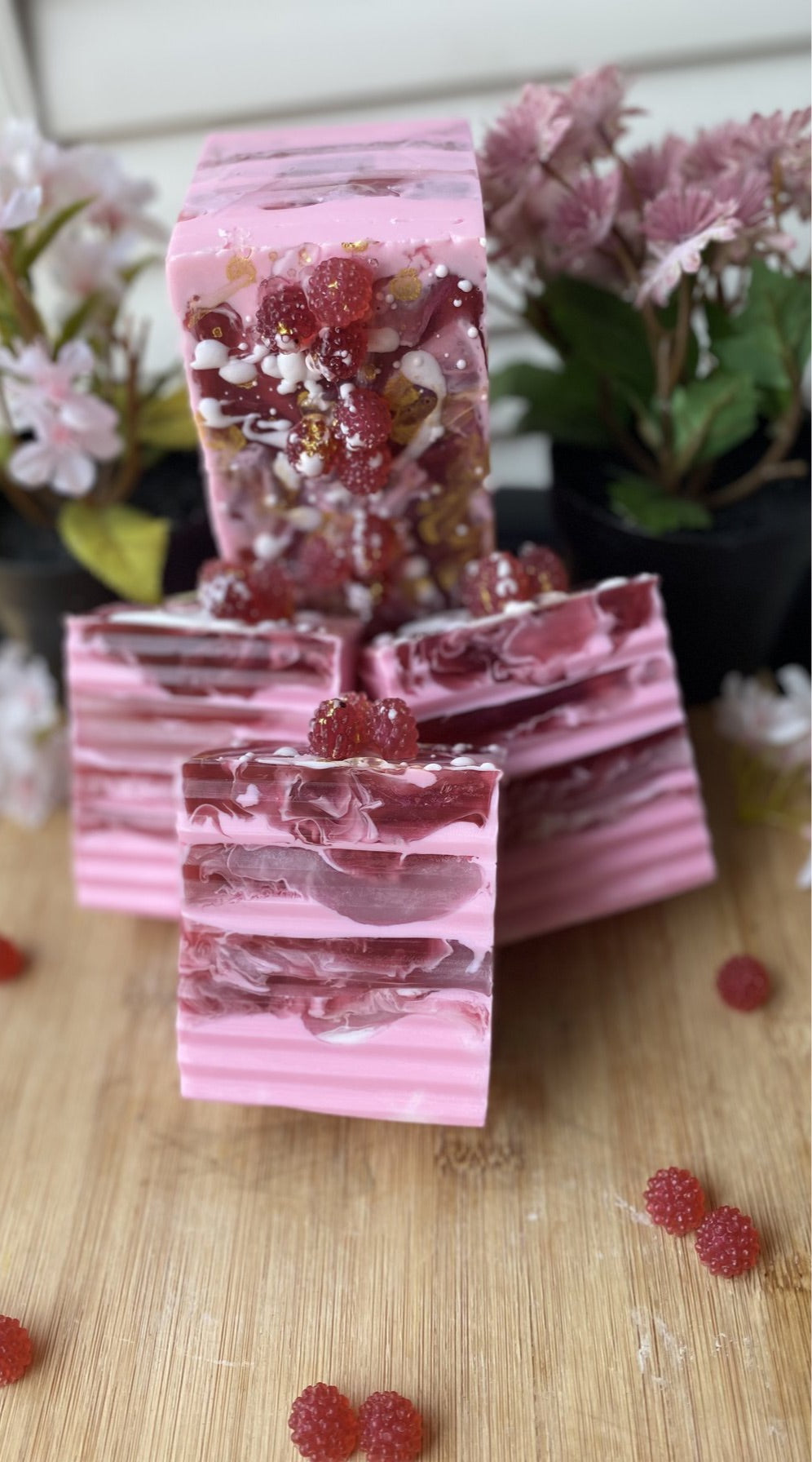 Infused with natural ingredients. Get twisted with this juicy and tangy bar! Yummy notes of Raspberry, Lemon, and fruity soap embeds! This bar was handcrafted using essential oils Raspberry F/O, Lemon F/O, Lemon E/O, Shea Butter, and much more. Use this bar to cleanse, moisturize, and boost your overall mood. For External Use Only.