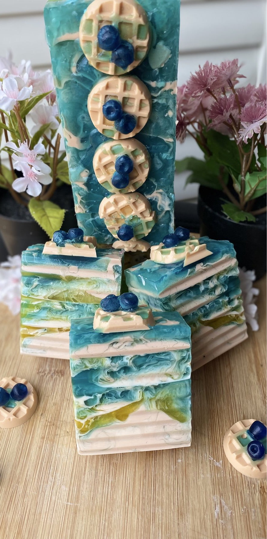Infused with natural ingredients. Enjoy the most important part of your morning with this bar! Delicious notes of Blueberry, Banana, & Pineapple with cute Blueberry waffle embeds! This bar was handcrafted using essential oils Cinnamon, Vanilla, Blueberry F/O, Pineapple F/O, Banana F/O, Shea Butter, and much more. Use this bar to cleanse, moisturize, and boost your overall mood. For External Use Only.